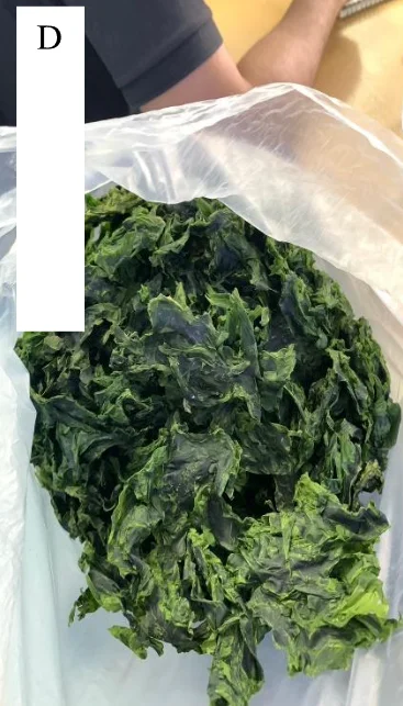 (A)Meeting and Discussing (B) Dry seaweed (G.fisheri) from K. Nirut’s farm (C) Zoom in dry seaweed (D) Dry seaweed (Ulva rigida) from Aquacuktic demoinstration
